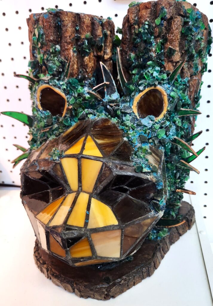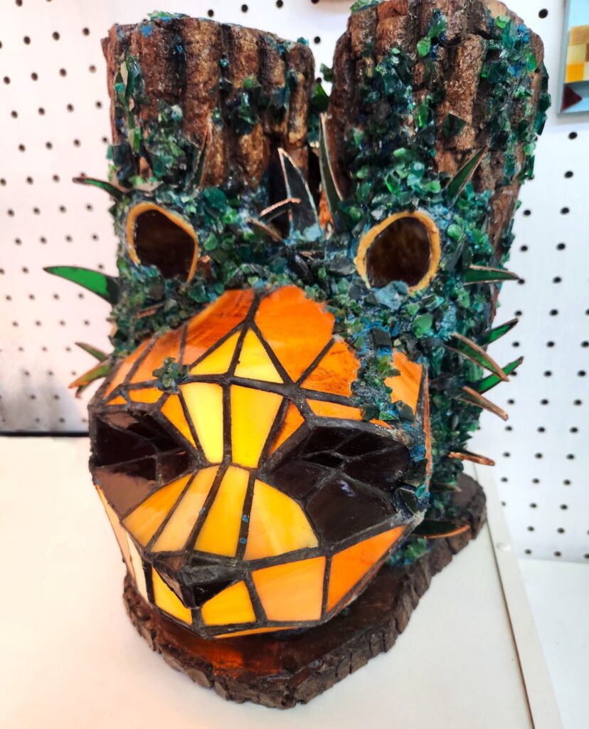 This captivating 3D stained glass bear head is a striking blend of art and nature. The bear's detailed stained glass features rich earthy tones that shimmer with light, while the interior of the head houses a soft, glowing light that acts as a lamp, casting a warm, inviting glow. The bear head sits atop a wooden platform, where logs are arranged behind it to mimic the look of trees in the woods, enhancing the sense of a wild forest scene. Stained glass green leaves emerge from the logs, while crushed green glass is scattered around t, carefully crafted to resemble moss. The combination of stained glass, wood, and glass elements creates a breathtaking piece that brings the beauty of the forest into your space.