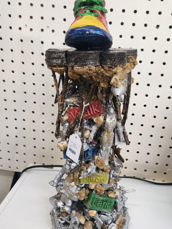 This poignant assembled sculpture features a towering stack of child's toys, carefully arranged to create a nostalgic and whimsical structure. The toys, from figurines to blocks, are painted in shimmering silver, giving them a timeless, unified look. Among the silver toys, a few brightly colored Legos stand out, spelling the phrase "A Walk Down Memory Lane." A colorful toddler's shoe can be seen standing on top of the stack, evoking memories of childhood and the fleeting moments that shape our lives.