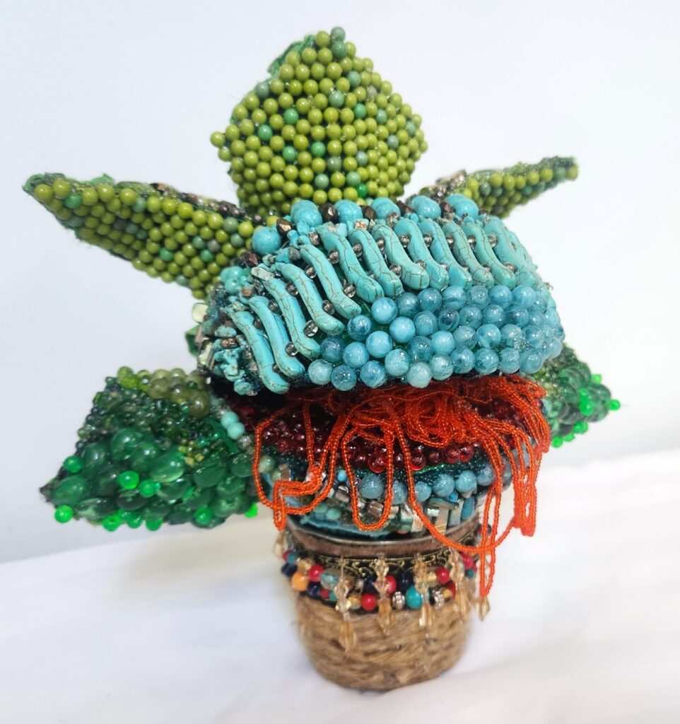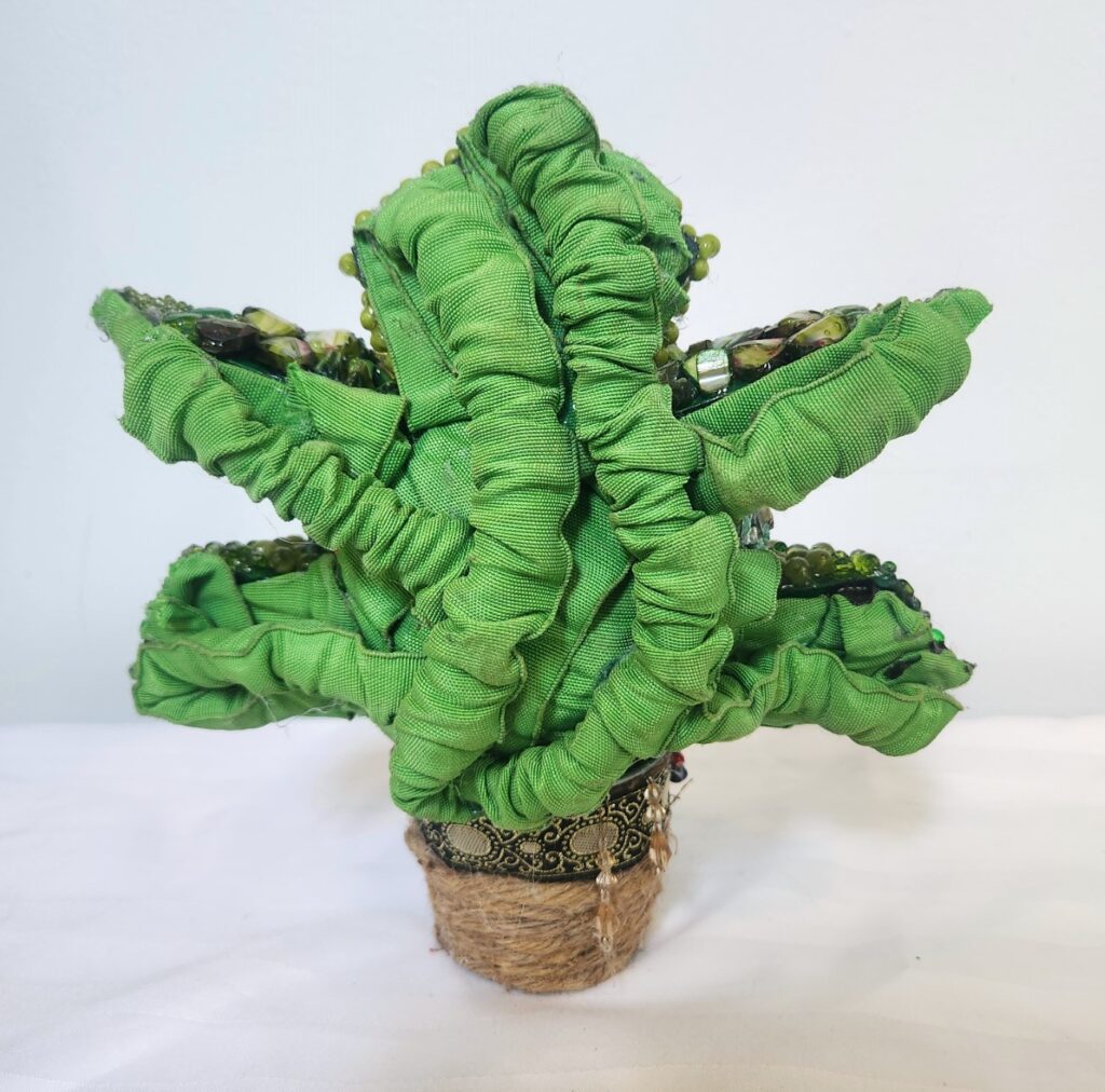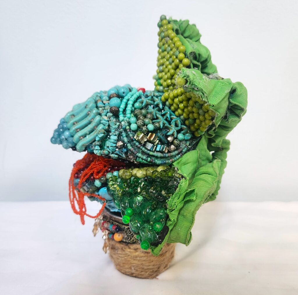 This is the fifth piece in our Audrey II series. This dazzling, bead-covered Audrey II brings a flashy twist to the famously hungry plant. Its head shimmers in turquoise tones, with green beaded leaves adding extra texture and sparkle. Even the planter gets in on the glam with its own beaded embellishments. In a cheeky nod to its appetite, Audrey’s open mouth appears mid-snack—chomping down on a bundle of red necklaces for a touch of humor and style. The back is covered in a soft, cushioned material for easy handling. It’s part monster, part fashion icon.