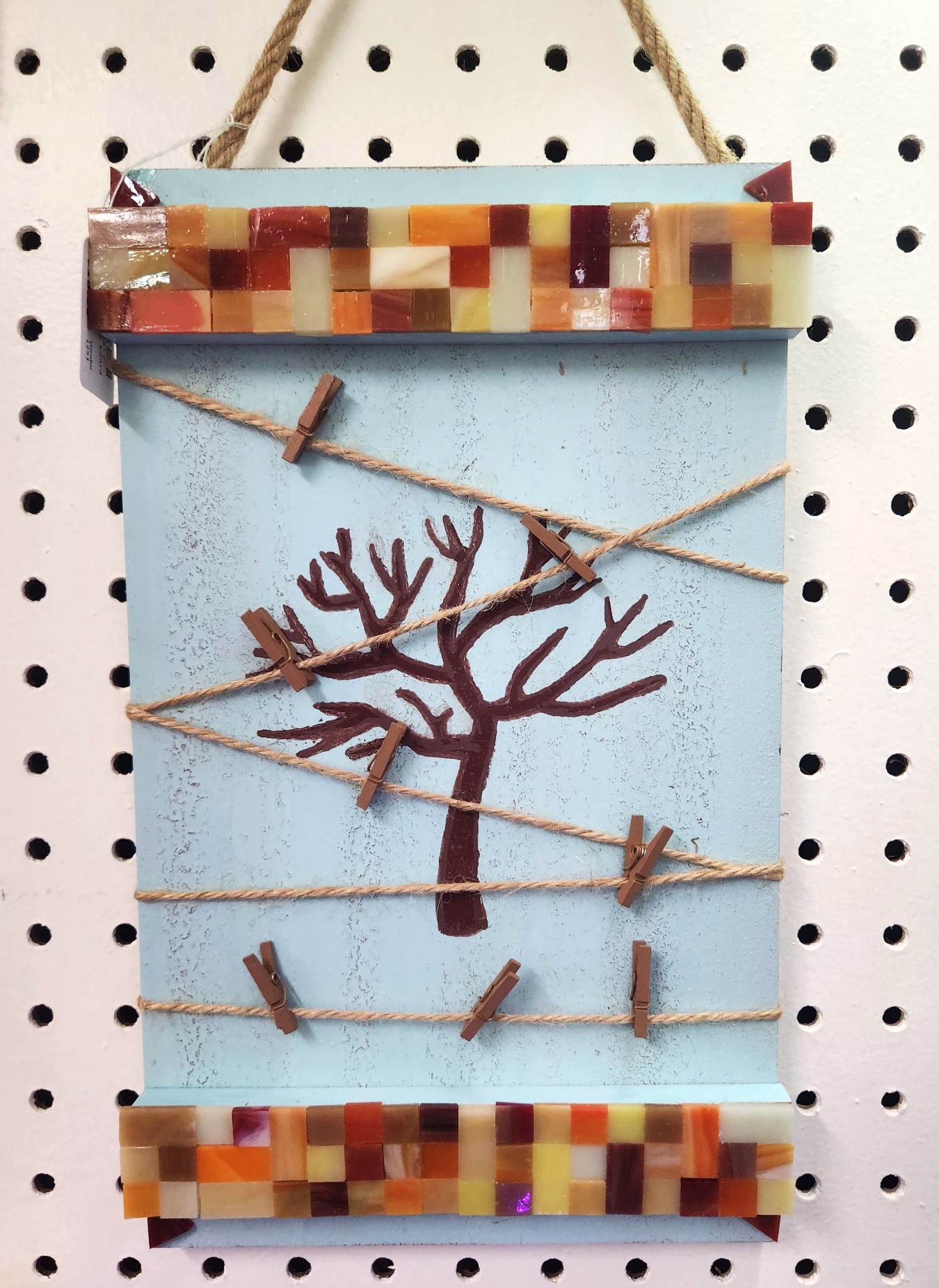 This rustic yet charming photo board features a hand-painted brown tree silhouette at its center, set against a serene blue-painted wooden background. Small, fall-colored mosaic tiles line the top and bottom edges, adding warmth and texture. Twine zigzags across the board where six miniature clothespins are affixed, perfect for displaying photos, cards, or mementos. A thicker twine is attached at the top, allowing for easy hanging. Blending functionality with seasonal beauty, this piece is a delightful way to showcase your memories.