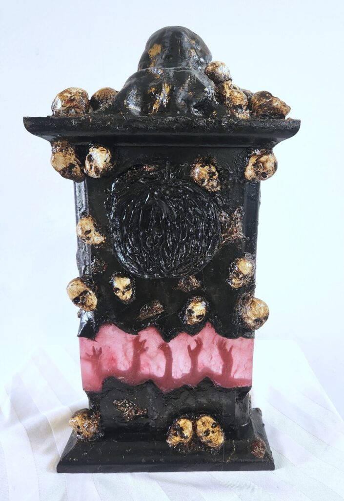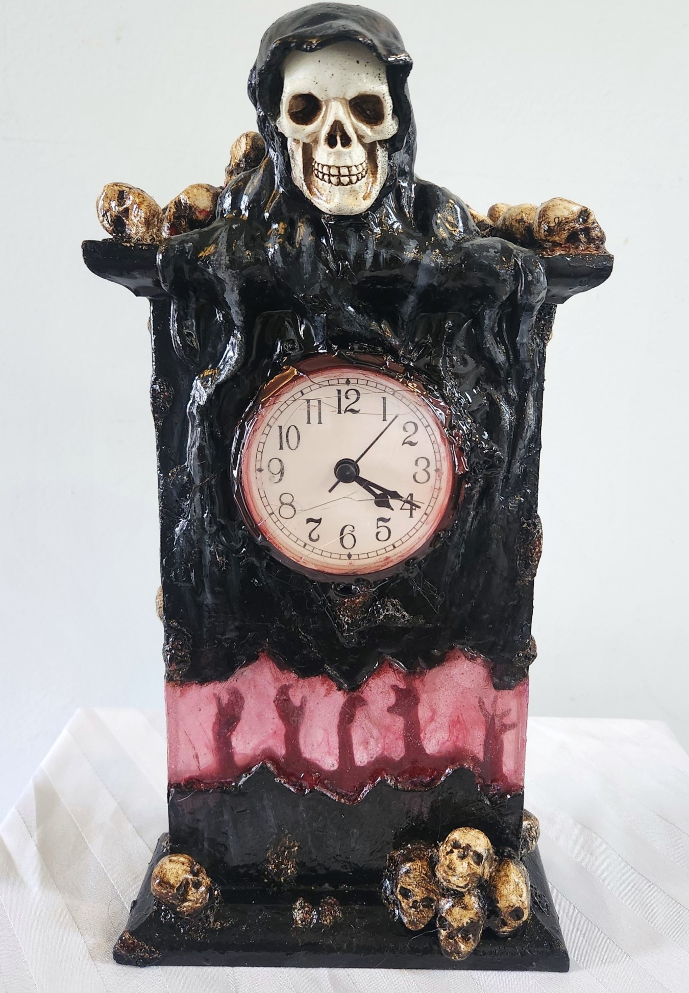 This striking art piece blends dark humor with a touch of eerie elegance. At its center, a clock ticks away, while at the top, a resin skull is draped in a sculpted cloak that envelops both the timepiece and smaller skulls of assumed past lives taken. Below, a clear resin frame showcases red hands reaching up from the depths, as though emerging from hell itself. With a playful yet haunting narrative, the piece suggests that Death stands guard over time, patiently awaiting the moment to claim you. A thought-provoking and macabre reminder that time is always ticking.