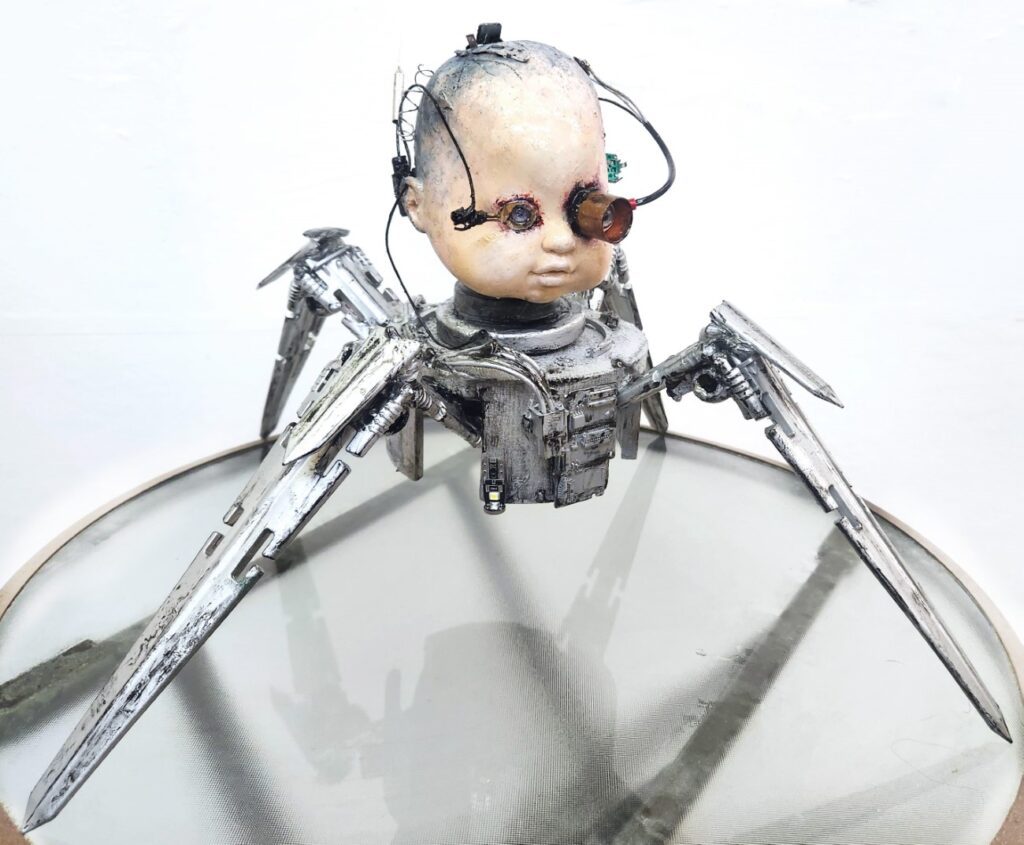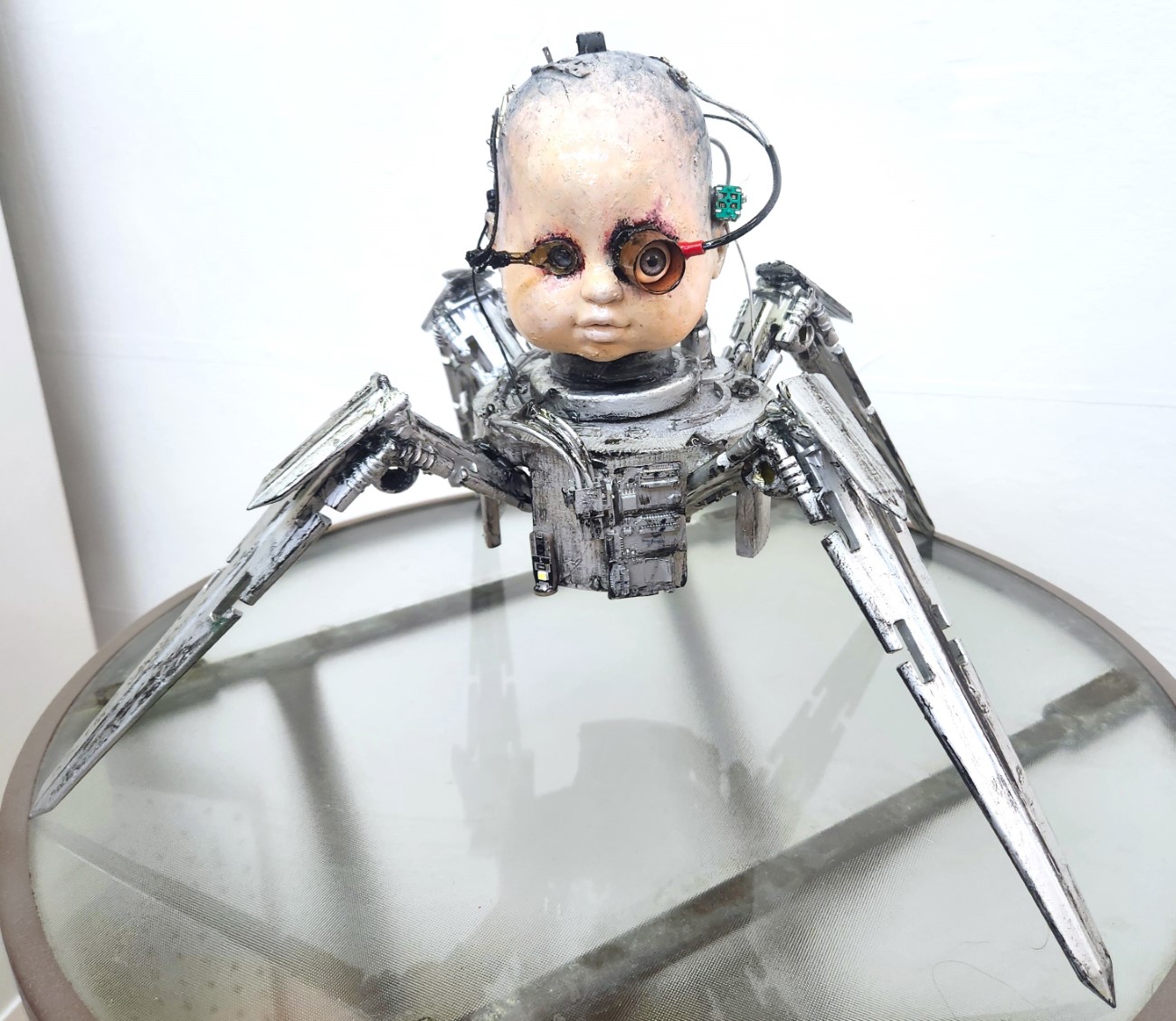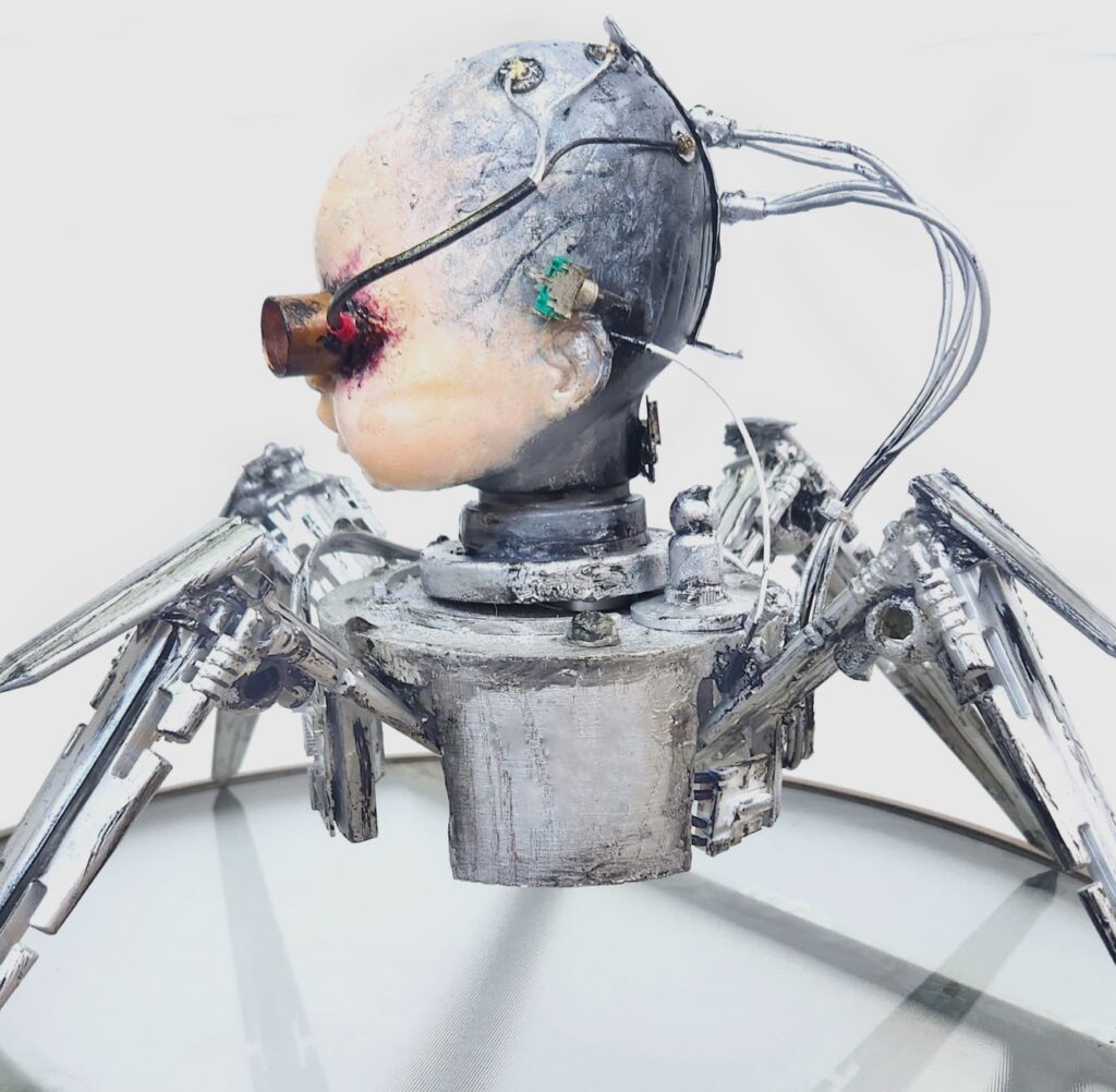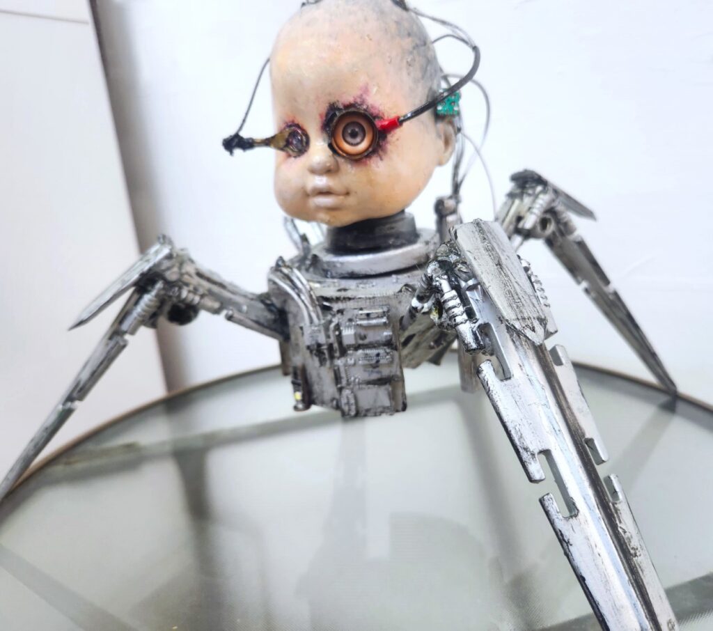 The Doll Head Robotic Spider sculpture channels a haunting, sci-fi energy—inspired by the Borg from Star Trek, it fuses the organic and mechanical into a single unsettling form. At its core is a vintage doll head, pale and expressionless, serving as the central body—its once-innocent features now made eerie by the invasive presence of machine parts.