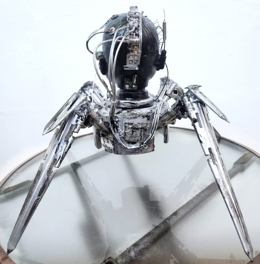 Emerging from the head are eight angular legs, crafted from found metal scraps, wires, and electronic components. Each leg is jointed like a spider’s, but with the sharp, utilitarian look of cybernetic limbs—cobbled together from broken tech and industrial debris, as if assimilated from a junkyard.