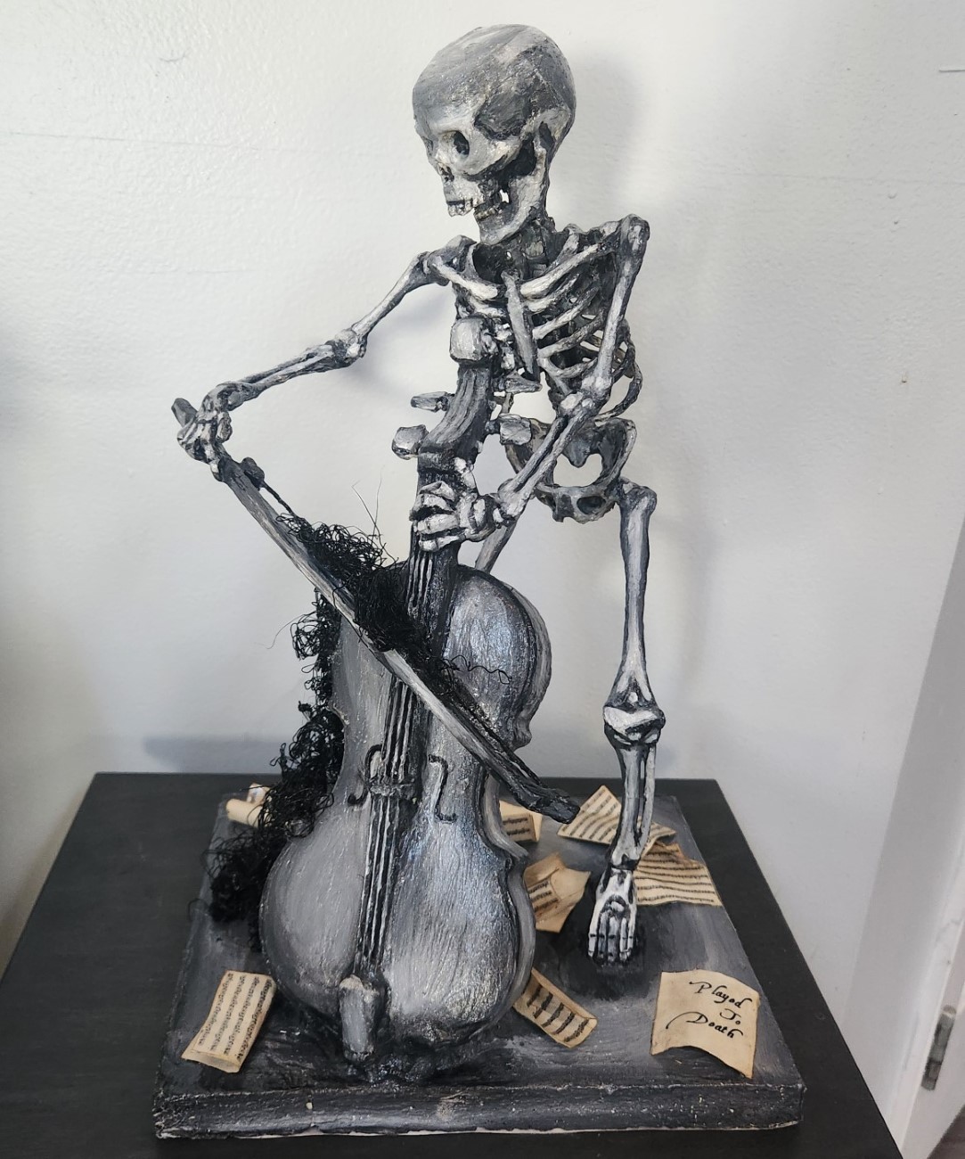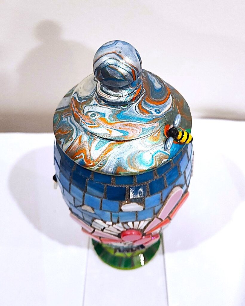 Two glass bead bumblebees are placed upon the urn's surface, adding both a layer of depth and whimsy. The lid is finished with a hand-painted swirl pattern that complements the imagery below it.
