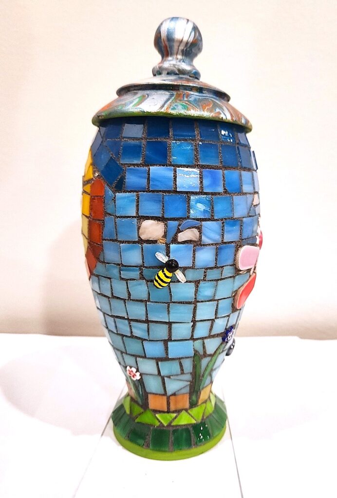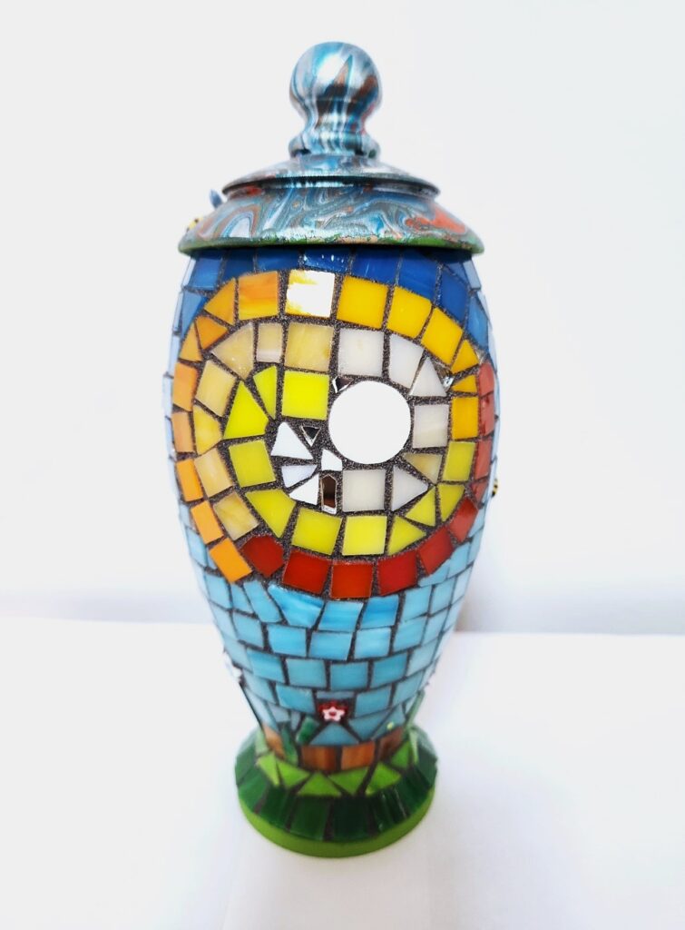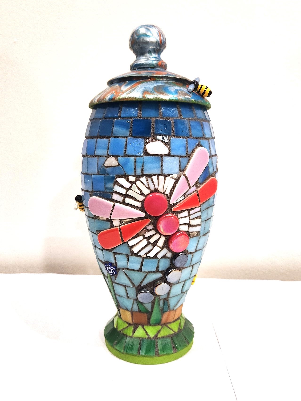 This urn is decorated with both mosaic and painted elements. One side displays a gorgeous dragonfly, while the other side depicts a bright and swirling sun - both constructed by the careful arrangement of colorful glass pieces outlined in a dark grey grout to create the scene.