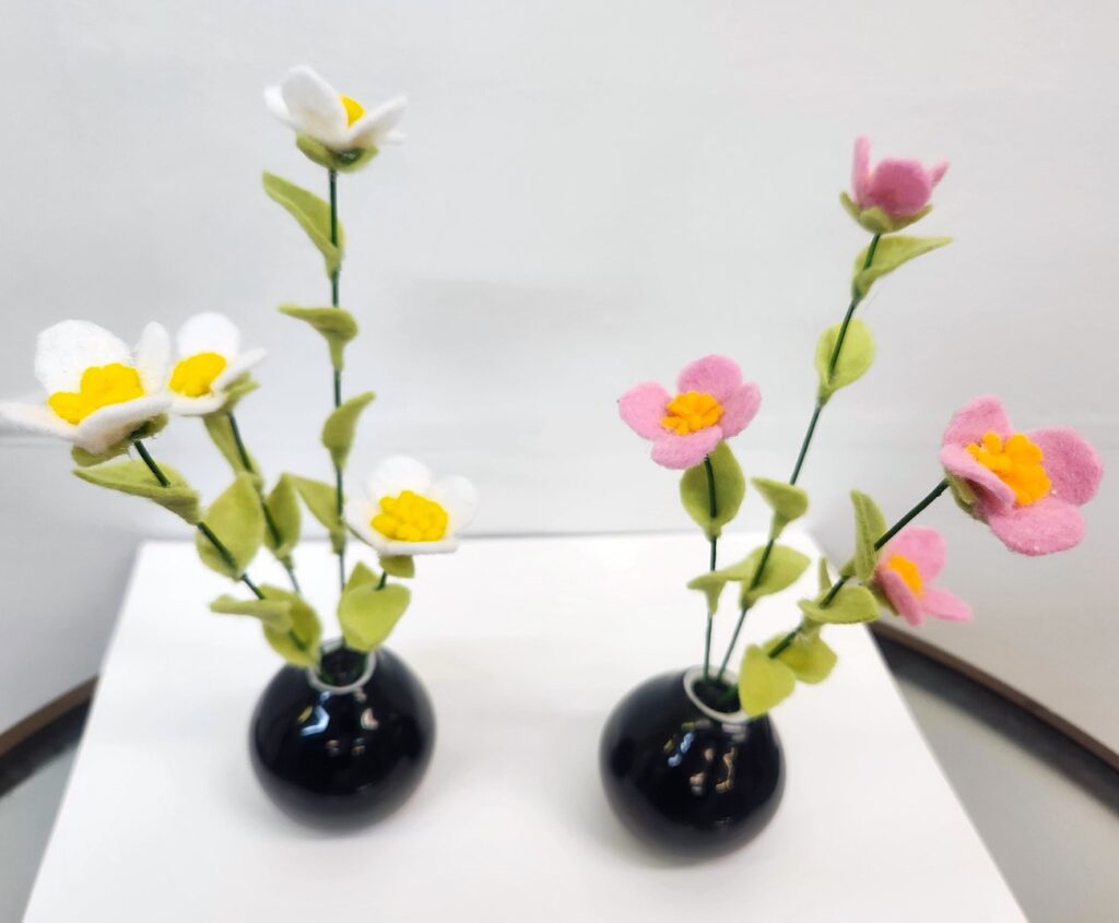 Tall felt flowers stand on thin wire stems, topped with clusters of tiny petals that give them a soft, textured look. Curved green leaves made of felt bend gently from each stem, shaped to mimic the natural flow of real foliage. Delicate yet sculptural, they feel both handmade and alive. Best of all, no need to water!