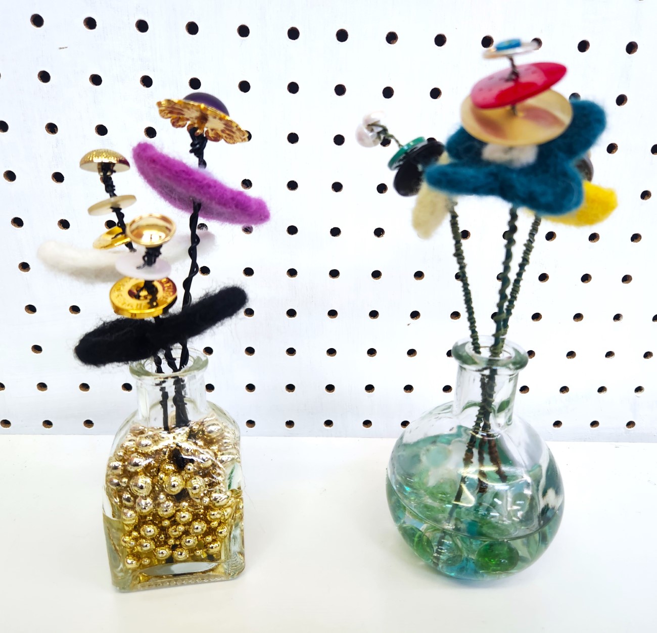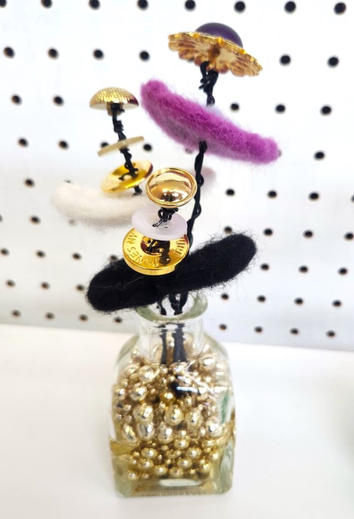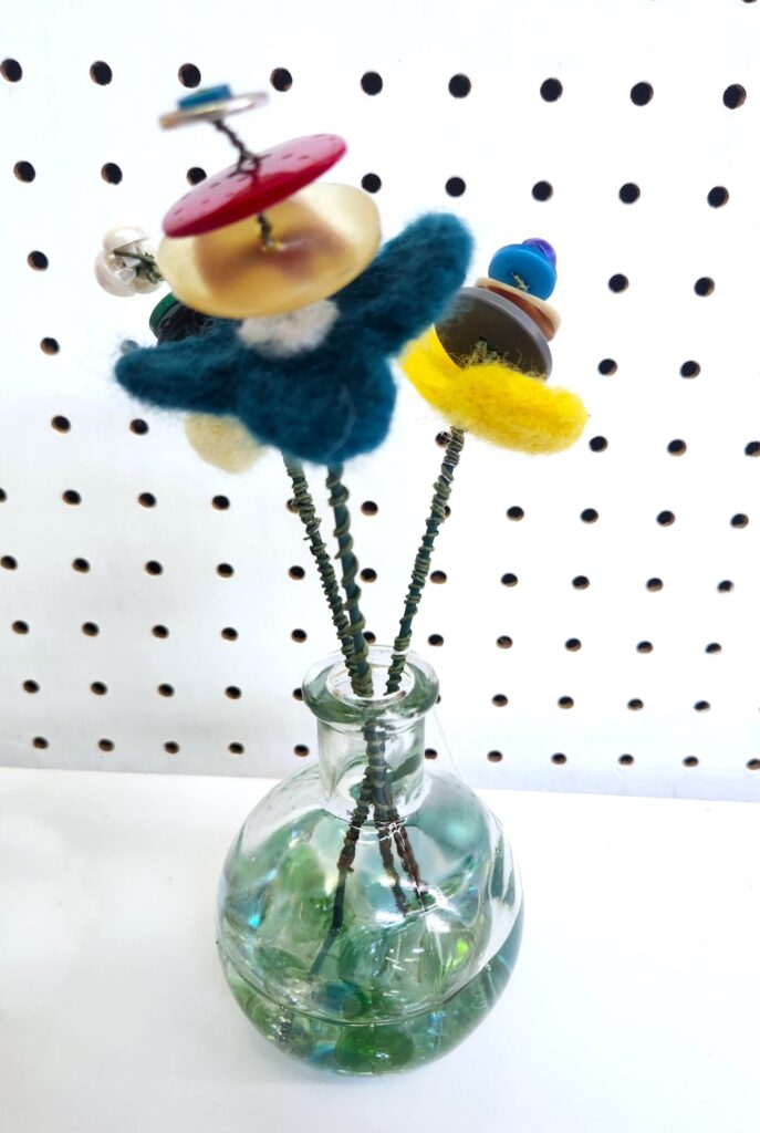 This enchanting piece features a small glass jar filled with a mosaic of colorful beads, solidified in clear resin to create a textured, shimmering base. From the jar, delicate handcrafted felt flowers and button flowers bloom, each attached to slender wire stems that give the arrangement a lifelike appearance. The soft felt petals and vibrant button centers stand in striking contrast to the shimmering beads below. This unique piece blends the tactile beauty of felt and buttons with the elegant transparency of glass and resin, creating a playful and artistic take on floral decor.