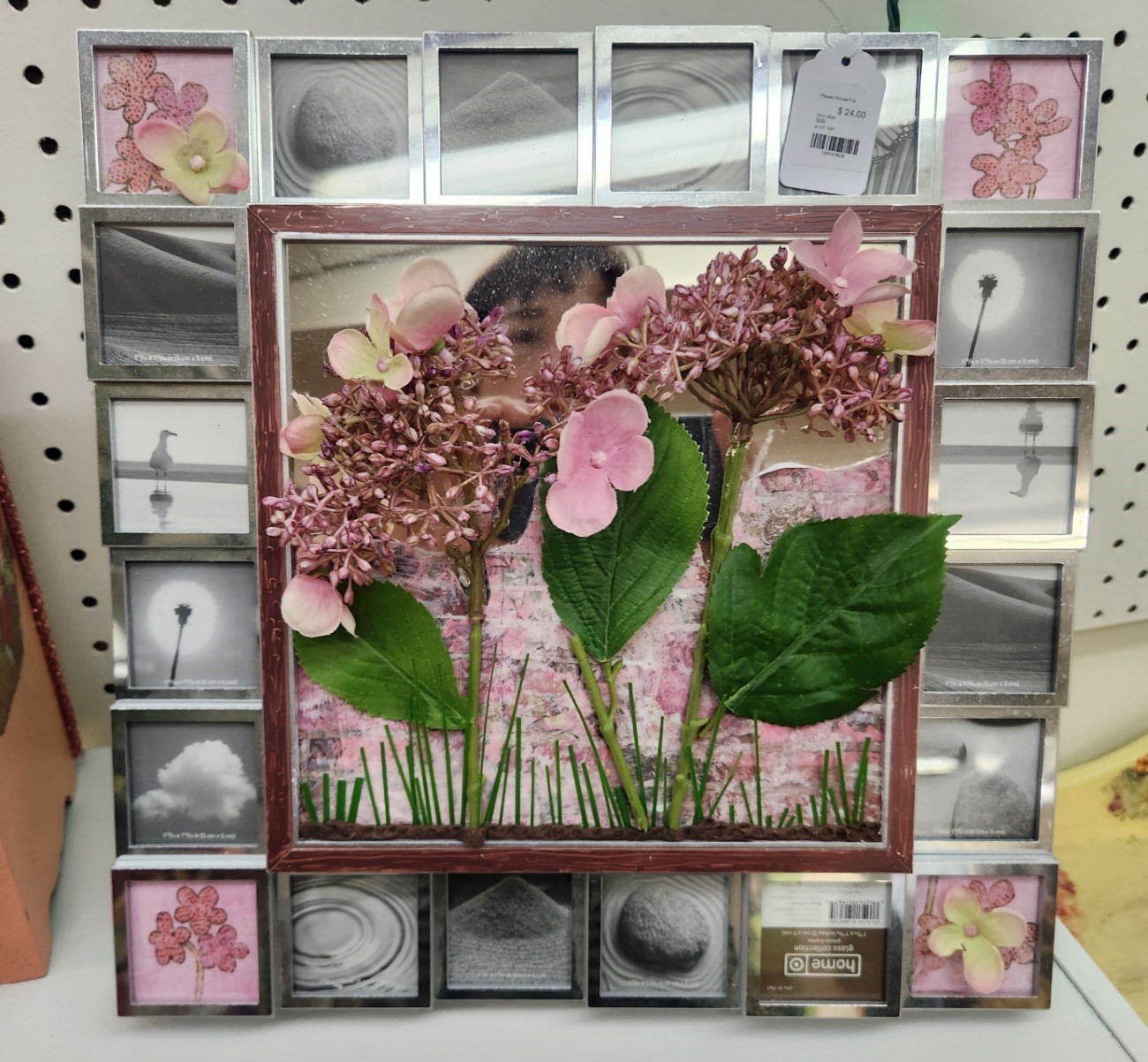This charming upcycled picture frame features a delicate floral design with a back mirror shining through. Bring a touch of nature to any space while showcasing your favorite memories.