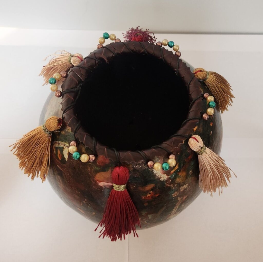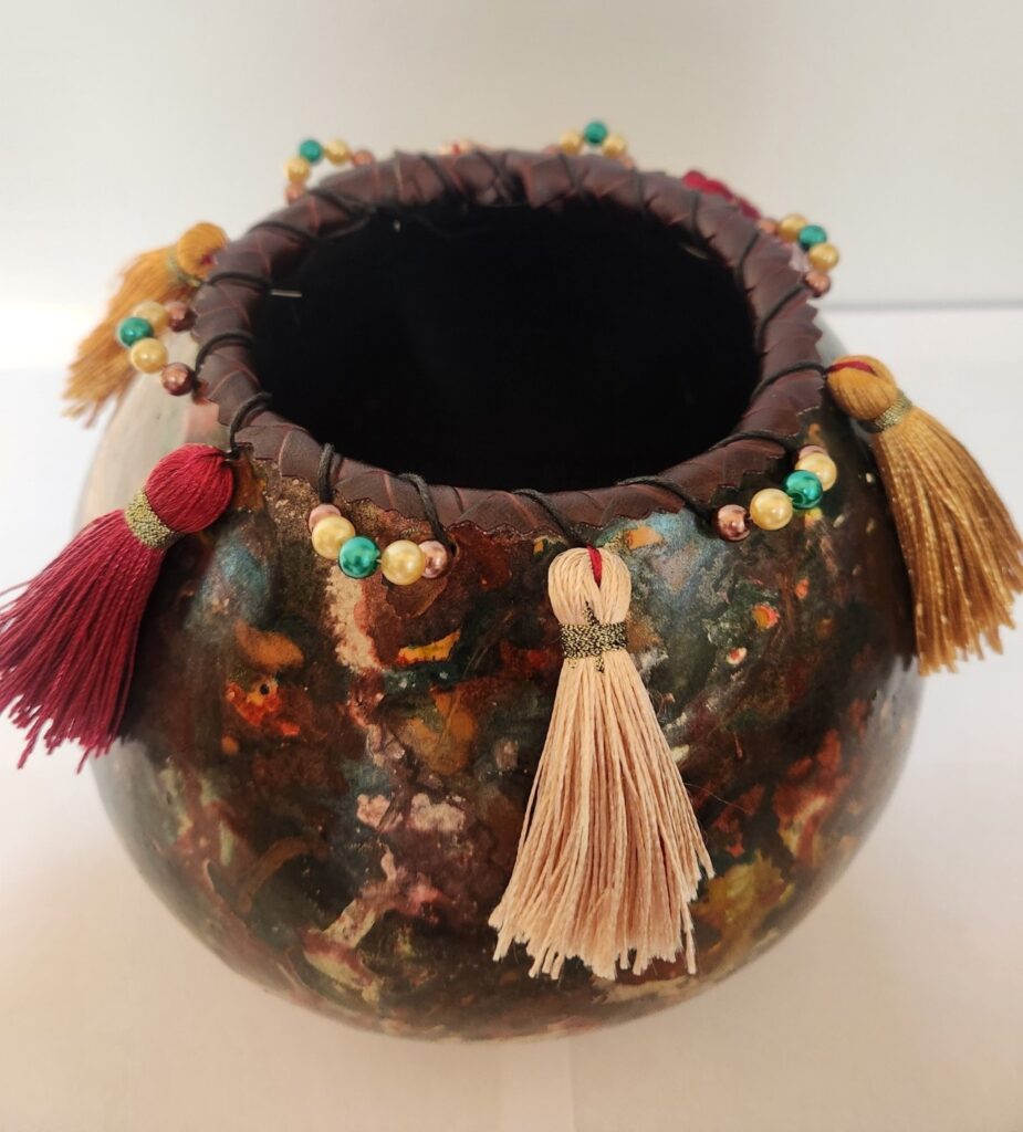 A hollowed large gourd finished in multiple glazed, jewel-toned colors. Accented with a leather top, decorative beading, and flowing tassels, this piece combines earthy form with rich ornamentation for a bold, handcrafted statement.
