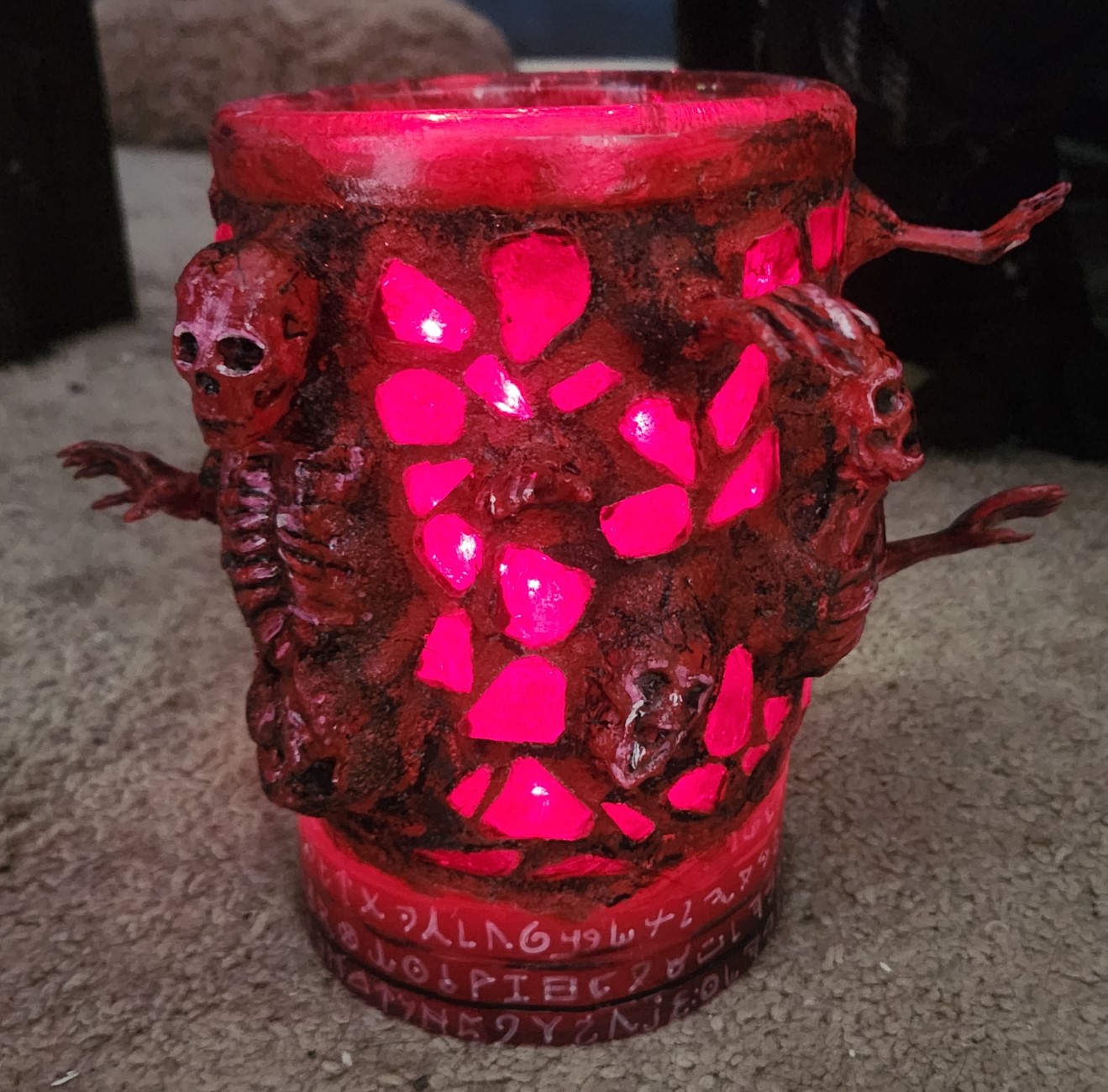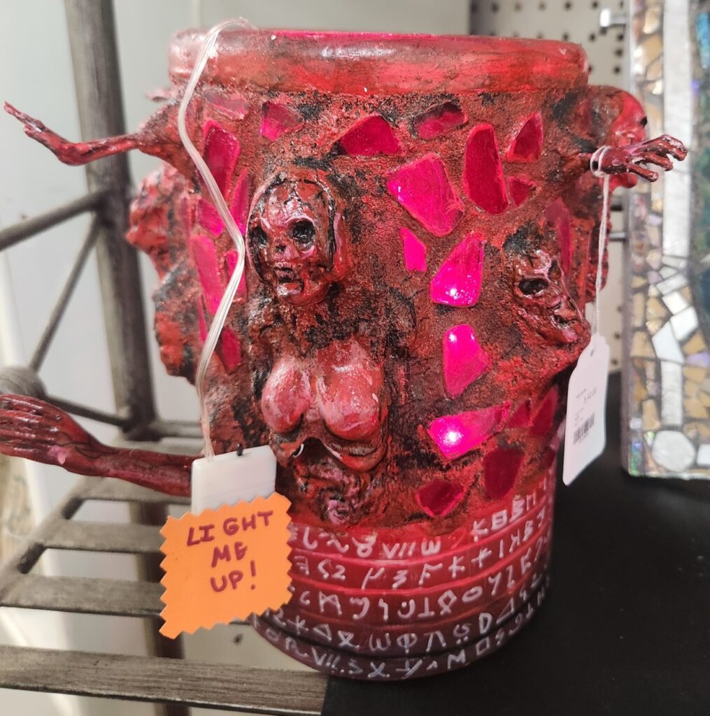 This dramatic glass candle holder is mosaic-covered with deep red glass, creating a fiery, intense backdrop. The intricate design depicts figures reaching out in desperation, their hands and faces contorted in an eerie attempt to escape from hell. The figures are carefully placed to evoke a sense of torment, blending art and emotion. The bottom of the candle holder features symbols that enhance its hellish theme, further immersing the viewer in its dark and haunting atmosphere.