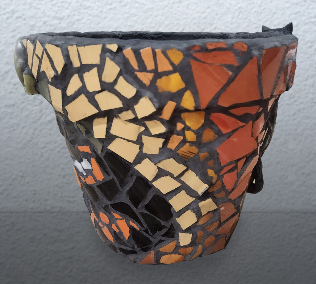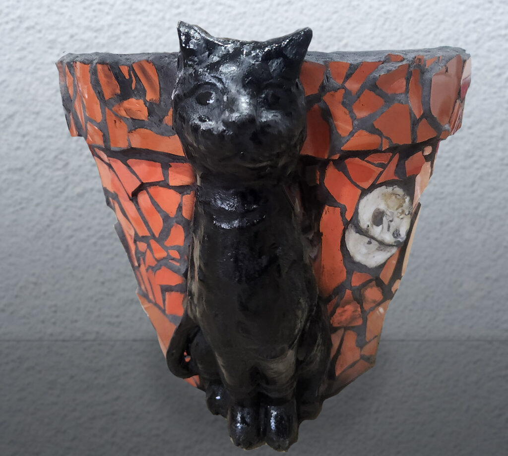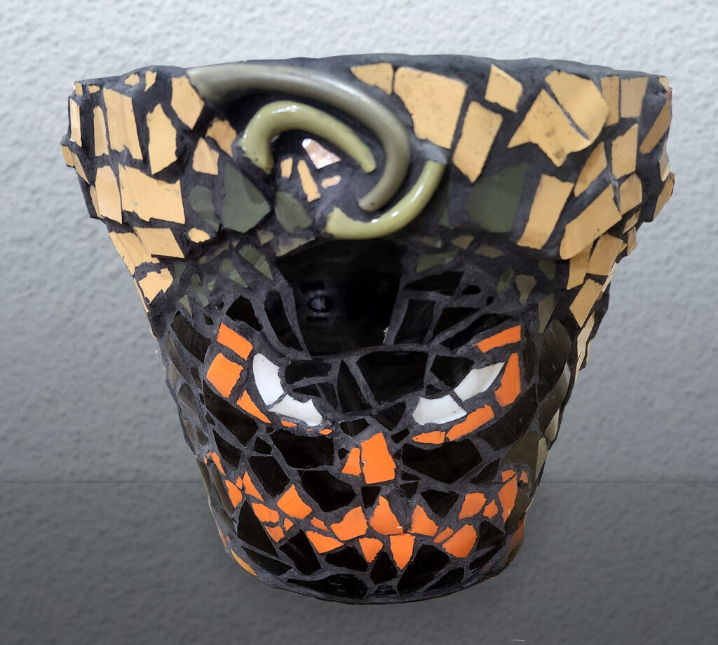 This striking large Jack-O'-Lantern planter is mosaic-covered with broken plates, transforming it into a one-of-a-kind piece of art. One side features a traditional Jack-O'-Lantern face, made up of colorful plate pieces while the opposite side features a 3D black cat emerging from the mosaic, adding depth and intrigue to the piece. Perfect for the ultimate Halloween lover!