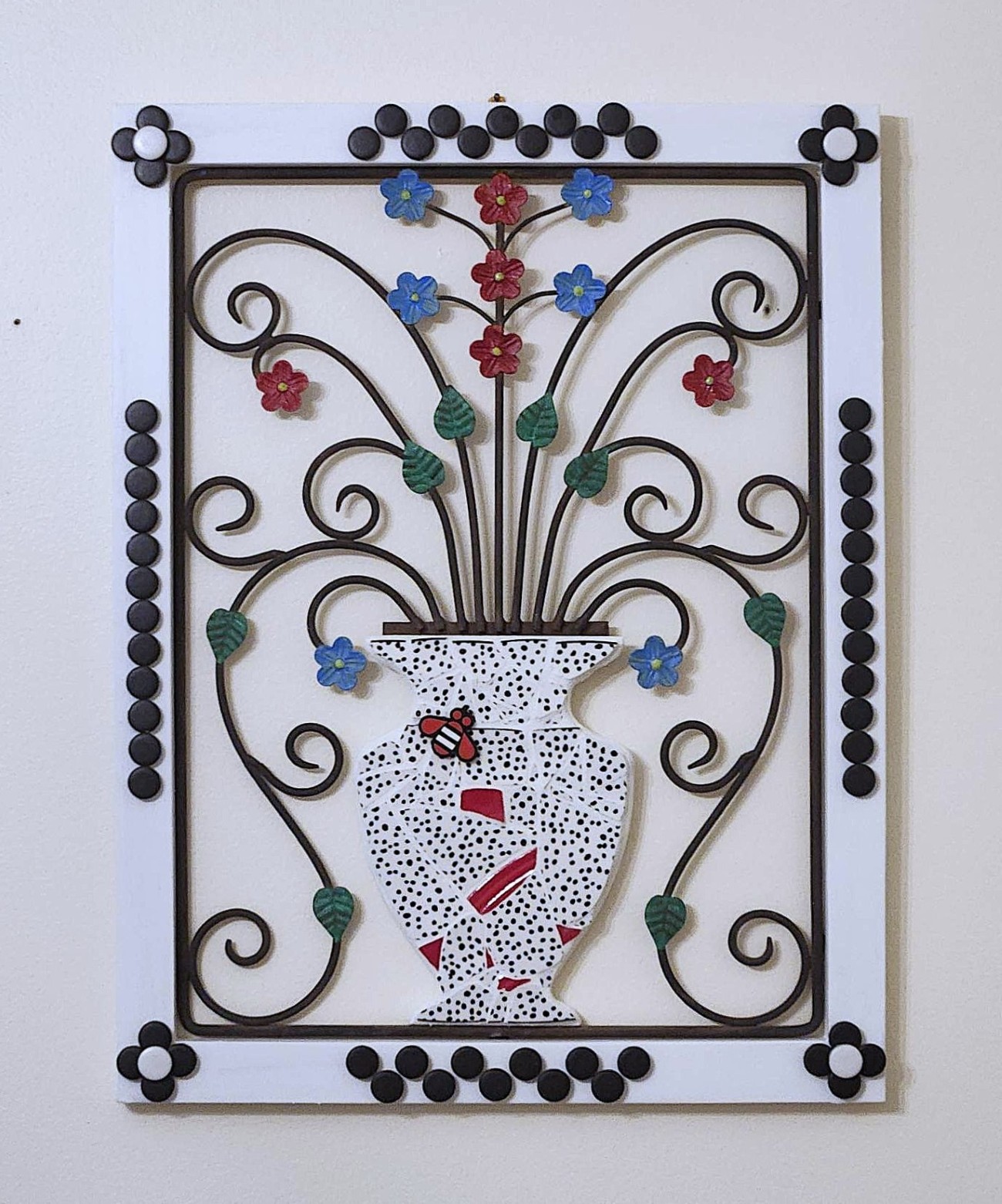 An upcycled wall hanging featuring a modern vase form crafted from reclaimed wood and wire, adorned with flowers. The Picassiette-style mosaic surface adds texture and visual rhythm, blending found materials with contemporary design for a unique, artful statement piece.