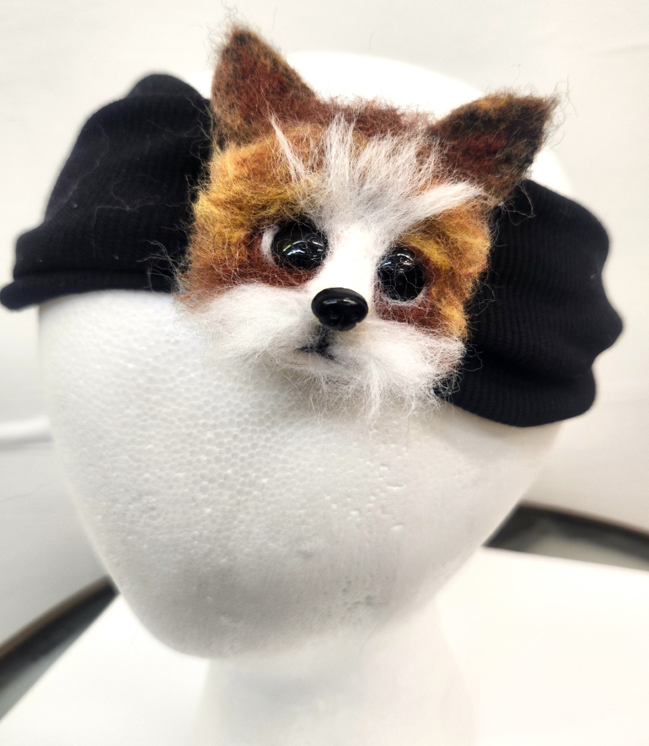 This handmade needle-felt dog pin is a delightful, tiny white terrier, carefully sculpted to mimic a fluffy coat with subtle brown accents on the face—around the eyes and ears.