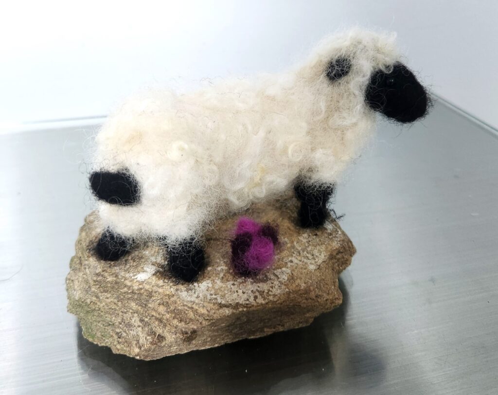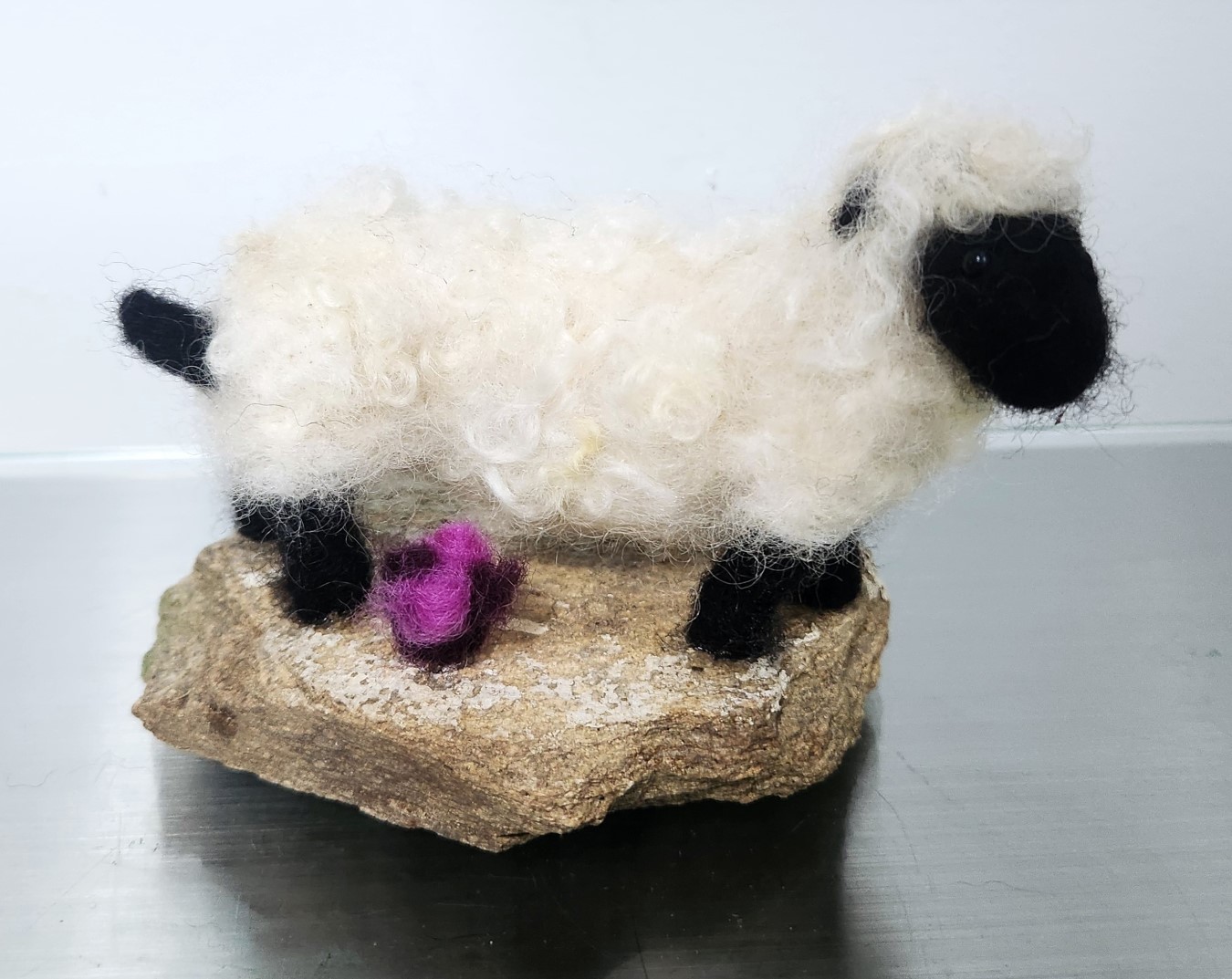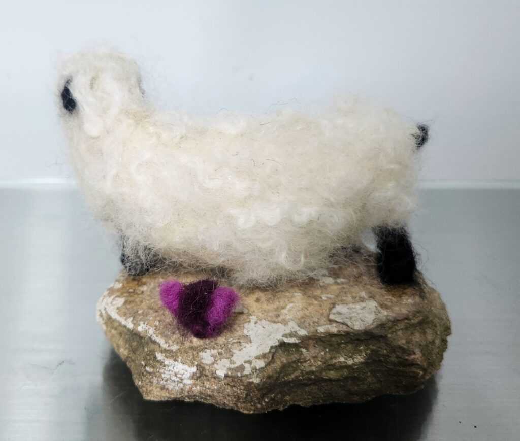 A three-dimensional sheep, crafted with needle felting, stands atop a real rock, its woolly form full of soft texture and gentle charm. Around its feet, small needle-felted purple flowers add a bright touch of color and a hint of whimsy. The combination of natural stone and felted details creates a peaceful, miniature scene that feels both rustic and playful.