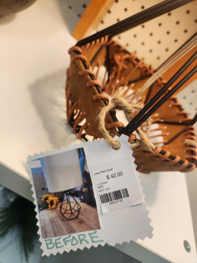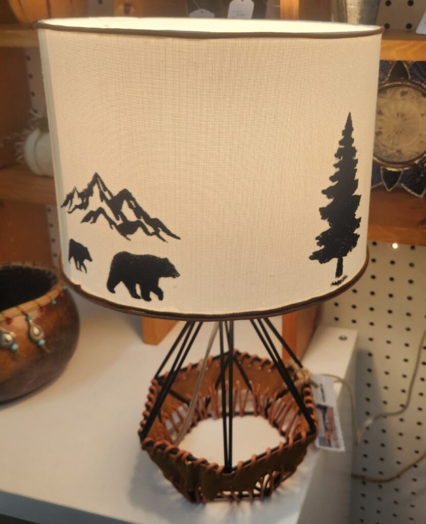 This upcycled lamp features a beautifully painted design of a deer, bear, and trees, bringing a touch of rustic charm to any space.