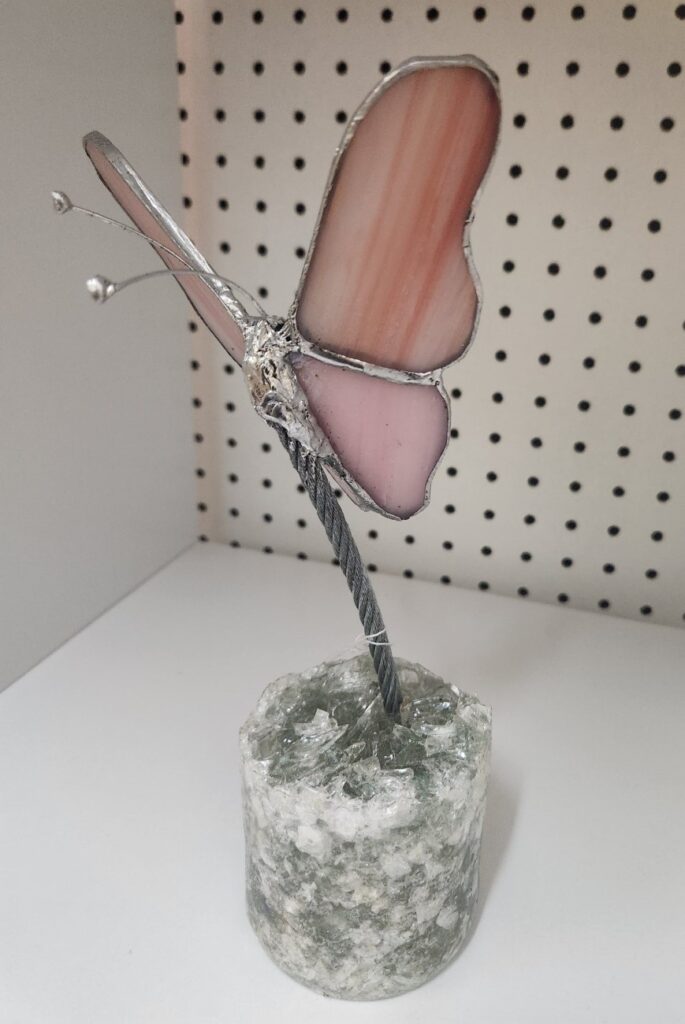 This stunning stained glass butterfly is beautifully adhered to a weighted resin base filled with broken clear glass. A piece of steel cable, meant to resemble a stem, connects the butterfly to the base, adding an industrial yet elegant touch. This unique artwork combines nature's beauty with artistic craftsmanship, making it a captivating addition to any space.