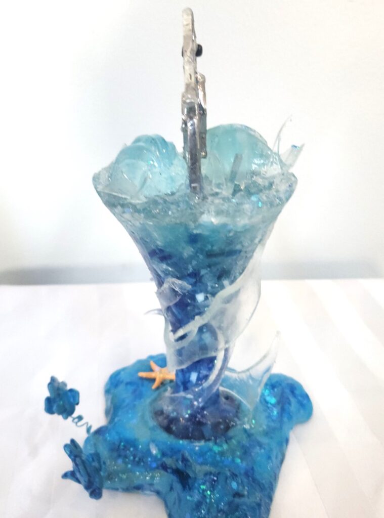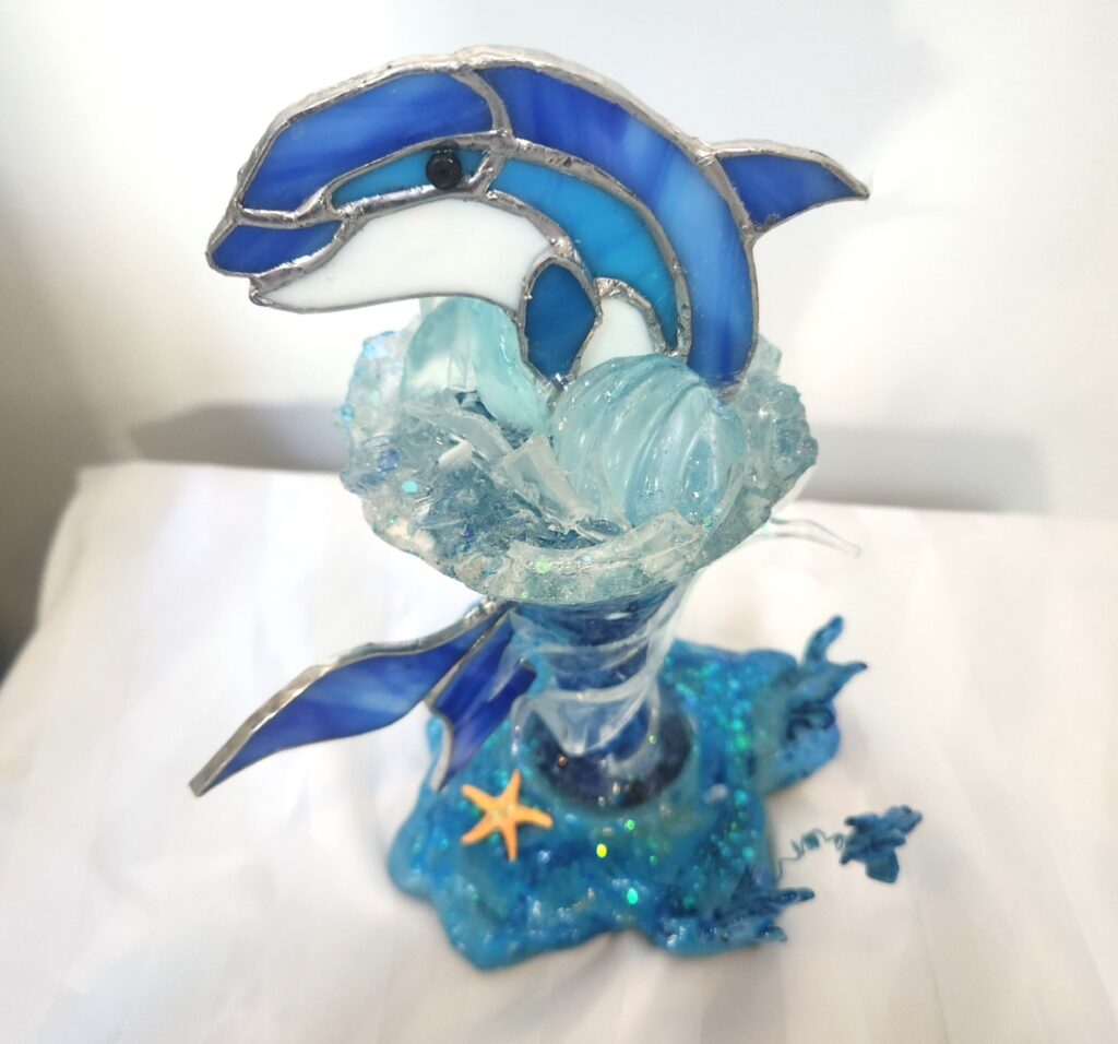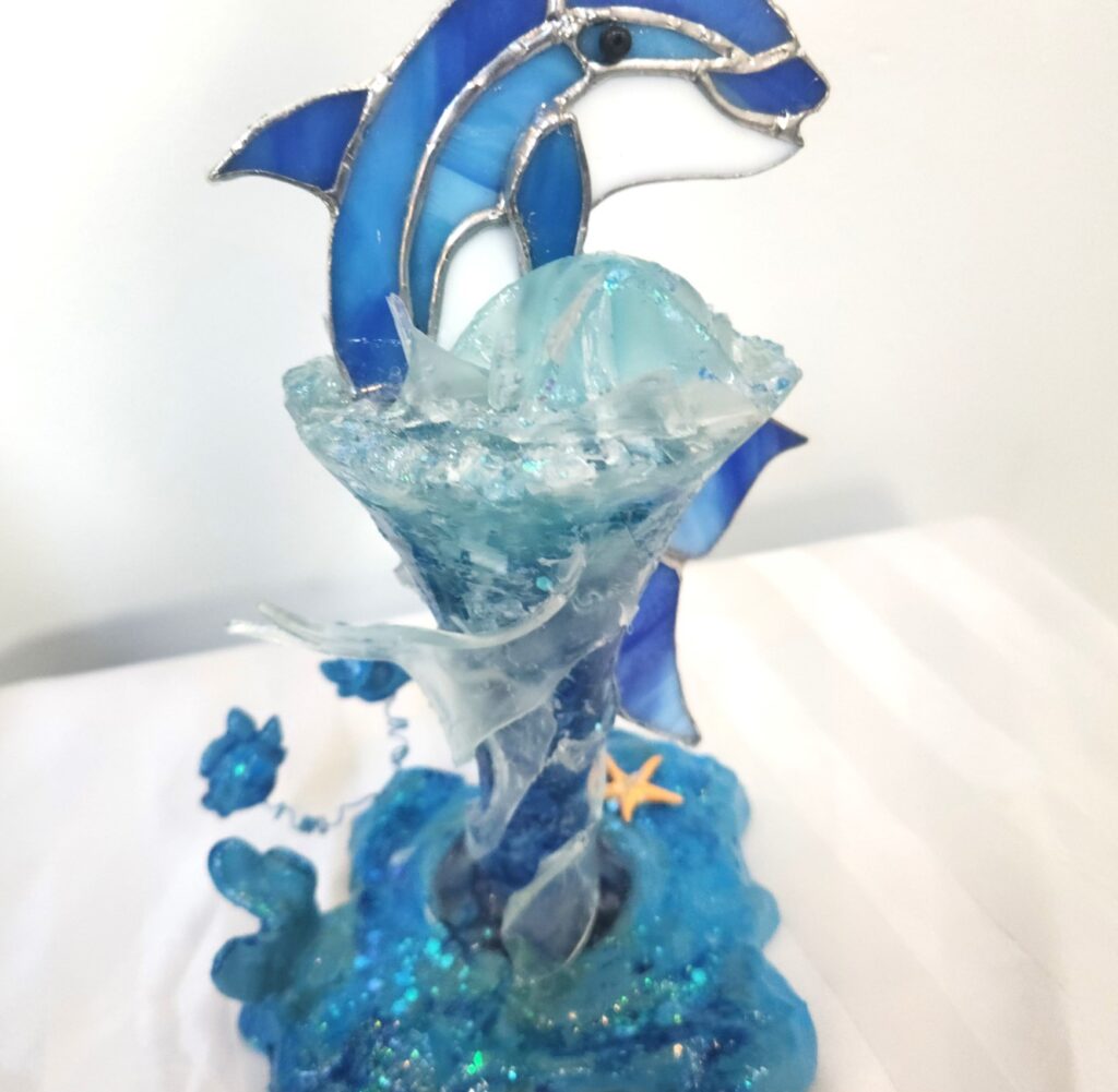 This beautiful stained glass dolphin is embedded in a vibrant blue resin base shaped like a whirling column of water. The dolphin’s intricate glass details shimmer with light, creating a dynamic, fluid display that captures the essence of the ocean's motion.