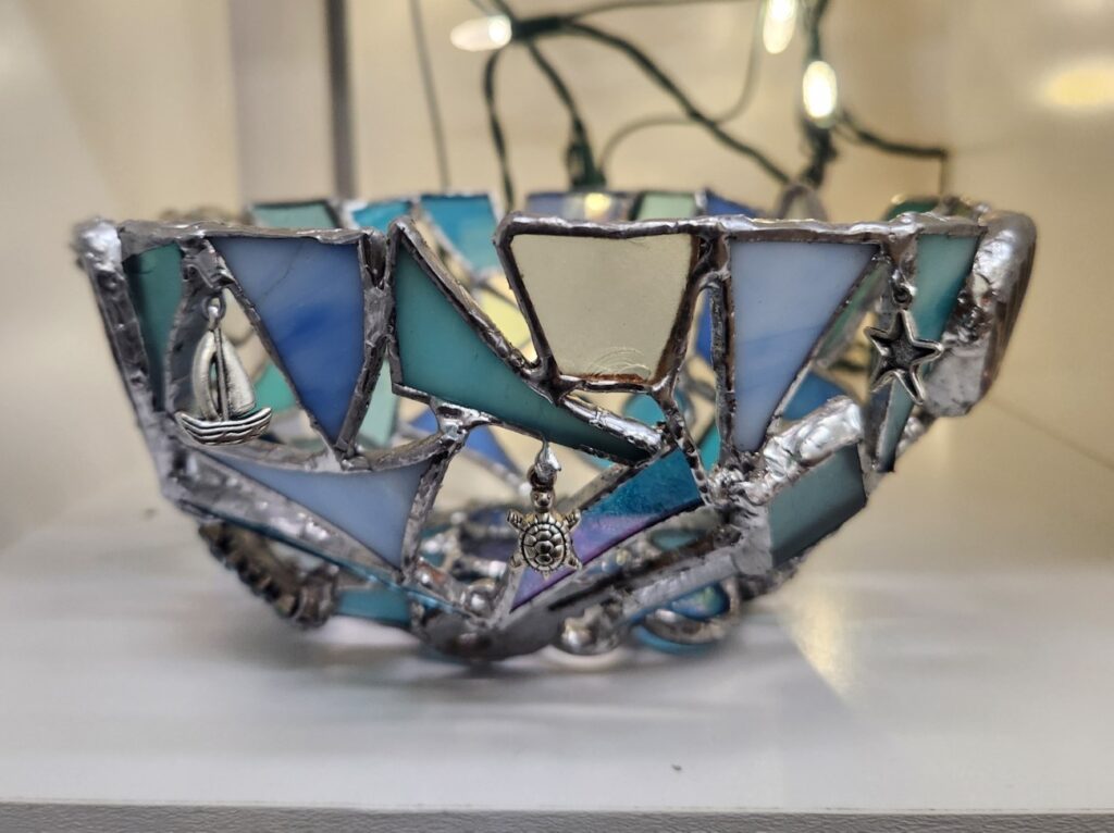 This beautiful bowl is shaped with a variety of stained glass pieces, shells, and ocean-themed charms, designed to evoke the serene beauty of the beach. The stained glass elements, in soft blues and greens, reflect the colors of the ocean and sky, while the clear glass shells add an elevated effect. Ocean-themed charms, such as tiny starfish and seashells, are thoughtfully incorporated into the design, enhancing the beachy vibe. The combination of materials creates a tranquil and coastal aesthetic.