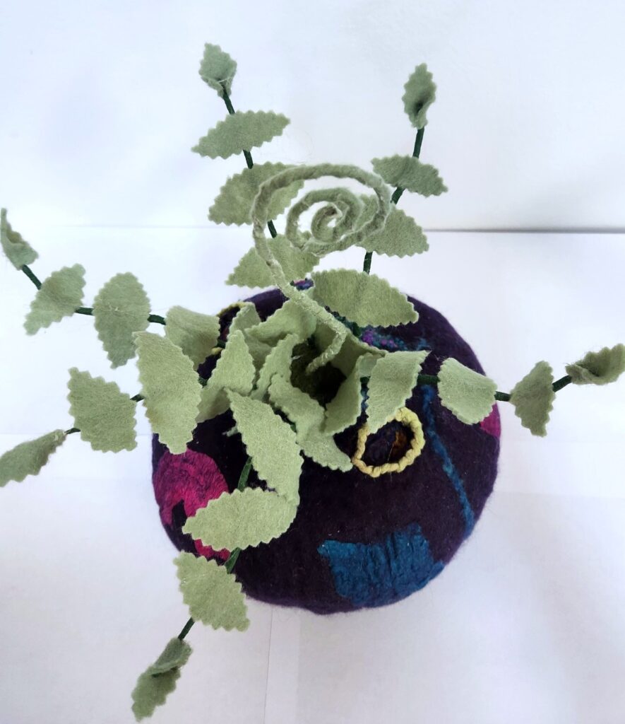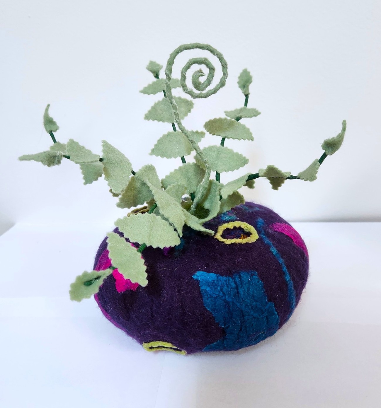 A wet-felted sculptural vase with integrated patches of color and small portal-like openings throughout the surface. A felted wire fiddlehead plant rests inside, which can be removed if you’d prefer to use the vessel as a small planter for a real plant. Organic, playful, and versatile, the piece balances function with imaginative form.