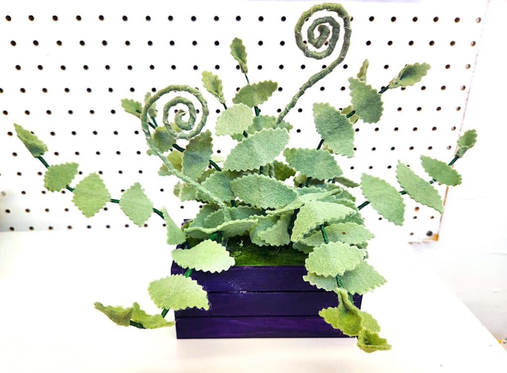 This playful art piece features a handcrafted felt fern-like plant that appears to grow effortlessly from a vibrant purple-painted wooden box. Each leaf is hand-cut from soft felt, giving the plant a natural, organic feel. Adding a whimsical touch, fun curled wire wrapped in felt extends from the plant, adding movement and charm. Perfect for bringing a pop of color and imagination to any space! Note the purple box itself measures 6" wide and 3.5" deep.